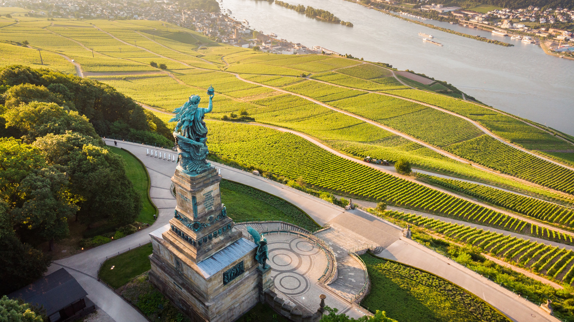 Se trata del mirador de Niederwalddenkmal, desde el que disfrutarás de una panorámica espectacular: los viñedos en terrazas, el majestuoso río Rin serpenteando entre colinas y, a lo lejos, el histórico monasterio de la Abadía de Eibingen, fundado por la célebre monja Hildegarda de Bingen. Una vista que resume la esencia del Rin Romántico en un solo vistazo.